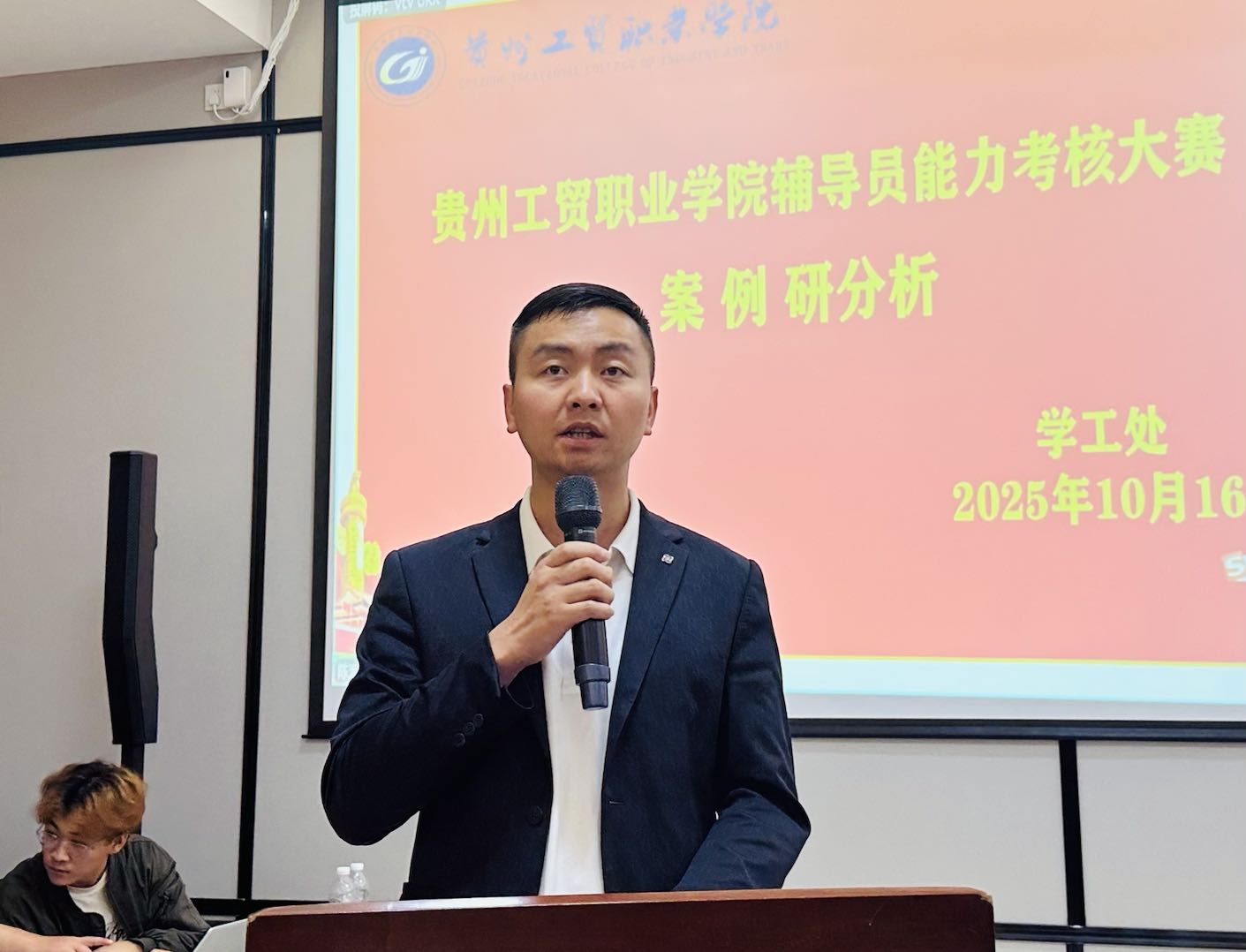 为深入贯彻党的二十大精神关于“加快建设高质量教育体系,发展素质教育,促进教育公平”的重要部署,全面落实新时代高校思想政治工作要求,切实锻造一支适配职业教育发展、贴合学生成长需求的专业化、职业化辅导员队伍,10月14日至17日,学工处牵头成功举办2025年度“育梦黔途・导者争锋”辅导员素质能力考核比赛。全体专兼职辅导员踊跃参与,历经多轮激烈比拼,大赛于10月17日在图书馆负一楼报告厅圆满落幕。