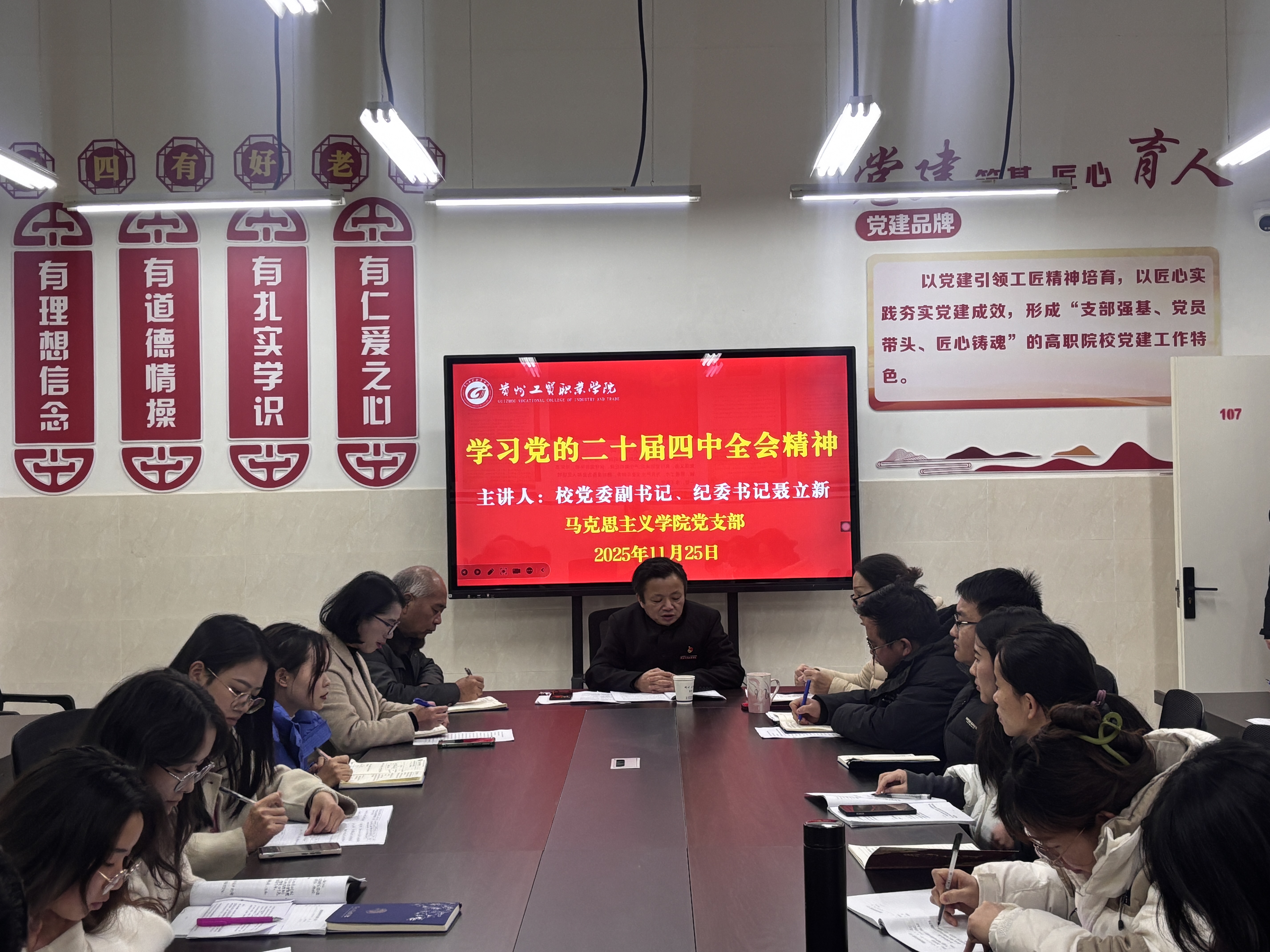 为深入学习贯彻党的二十届四中全会精神,11月25日,在2号教学楼107党员活动室,学校党委副书记、纪委书记聂立新为公共基础教学部和马克思主义学院全体党员宣讲党的二十届四中全会精神。