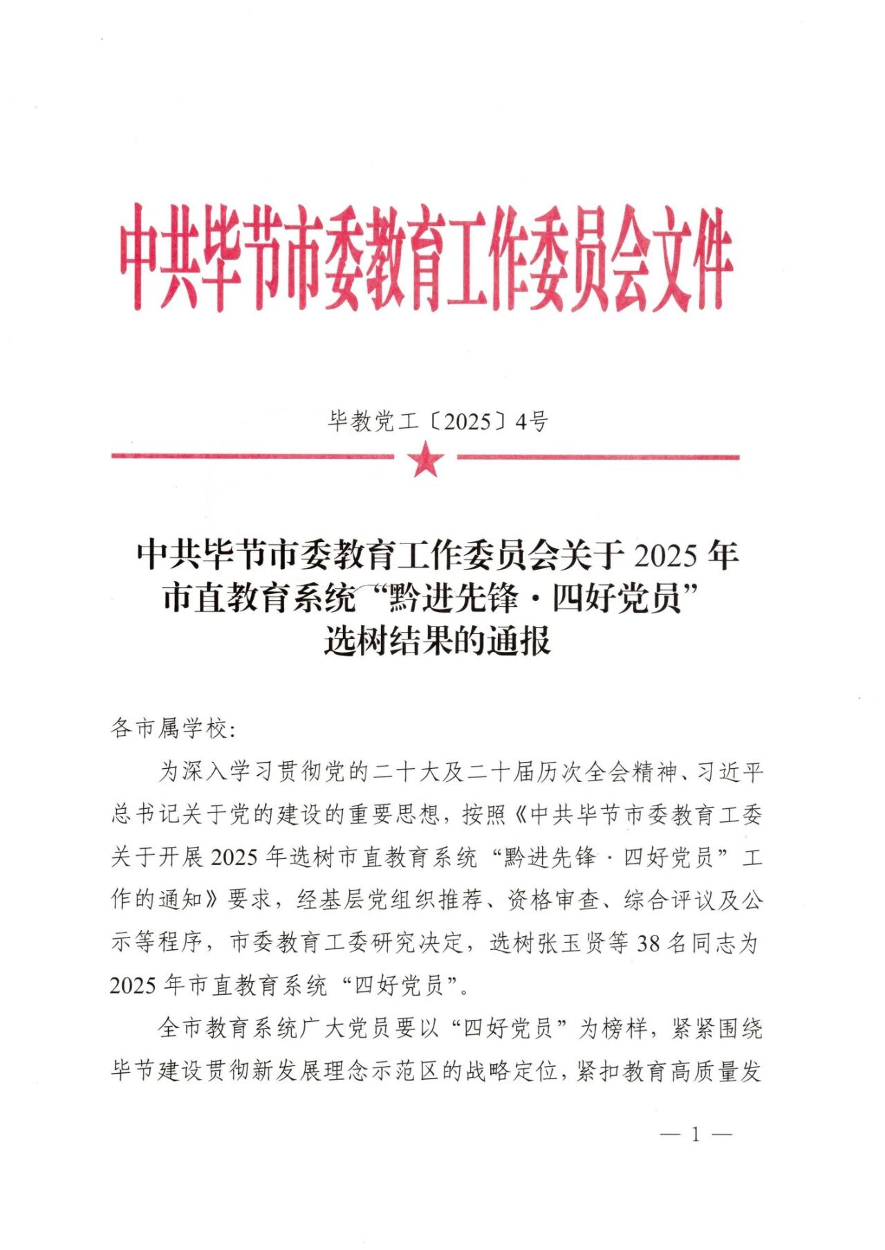 近日,中共毕节市委教育工委关于2025年市直教育系统“黔进先锋·四好党员”选树结果通报的文件中,贵州工贸职业学院张功杰、朱丽娟、马学刚3名教师荣获“黔进先锋·四好党员”荣誉称号。